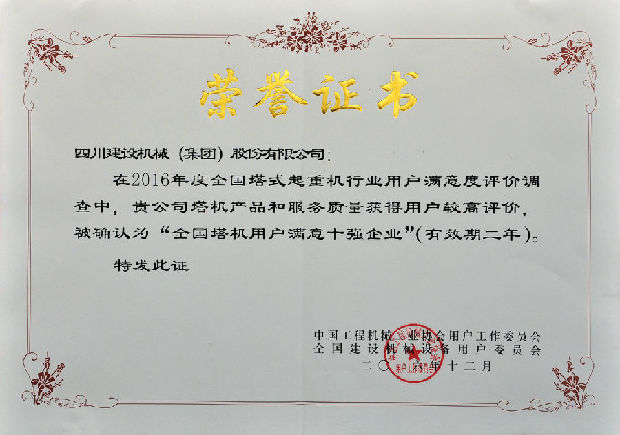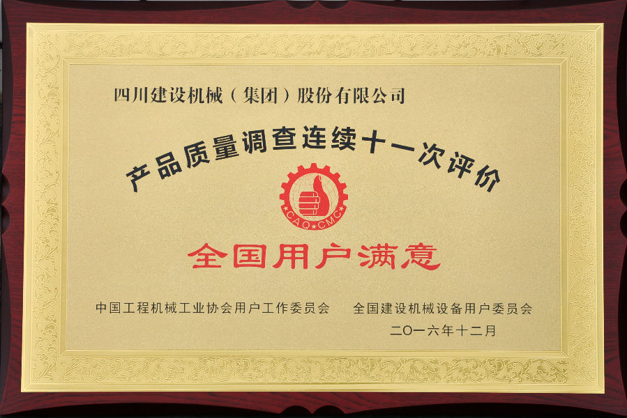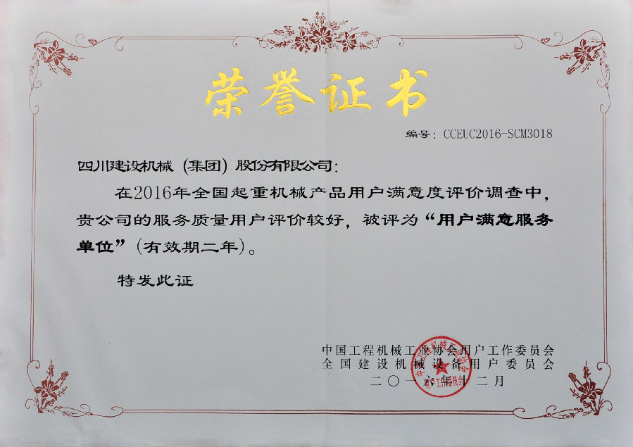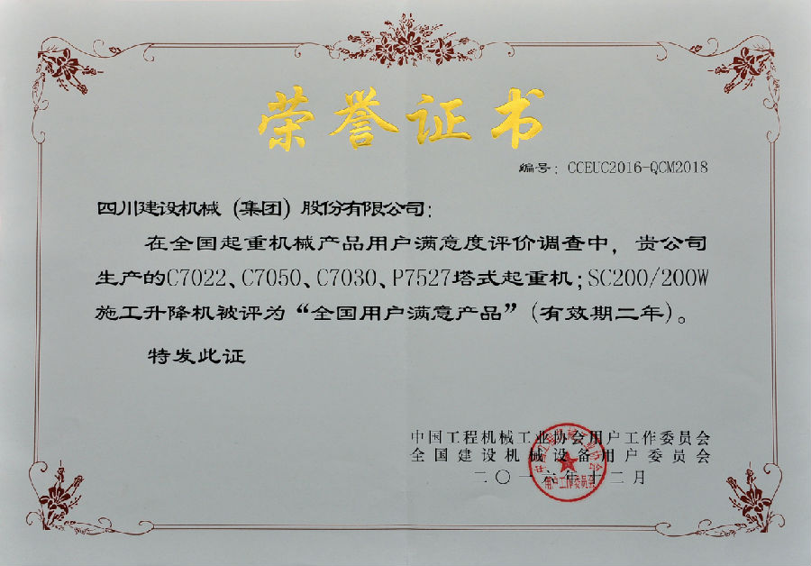2016年全國用戶滿意產(chǎn)品評價測評結(jié)果公布,四川建設(shè)機械(集團)股份有限公司憑借良好的產(chǎn)品和服務(wù)質(zhì)量獲得全國用戶的較高評價,榮獲了“全國塔機用戶滿意十強”企業(yè);獲得產(chǎn)品質(zhì)量調(diào)查連續(xù)十一次評價“全國用戶滿意”企業(yè);公司生產(chǎn)的C7022、C7050、C7030、P7527塔式起重機以及SC200/200W施工升降機被評為“全國用戶滿意產(chǎn)品”;同時獲得“用戶滿意服務(wù)”獎;1989年至今川建已連續(xù)十一次獲得全國用戶滿意獎,得到了業(yè)內(nèi)用戶的高度認可。