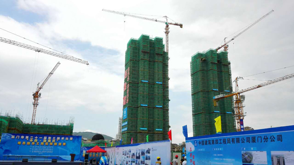 本次比賽地點(diǎn)設(shè)在海滄生態(tài)花園項(xiàng)目施工部。該項(xiàng)目共有川建8臺(tái)塔機(jī)參與施工,其中6臺(tái)C6013塔機(jī)、2臺(tái)C6010塔機(jī)。該項(xiàng)目為民建住宅,建筑面積約20萬(wàn)平方米,為 46層超高層住宅,最終塔機(jī)使用高度將達(dá)到150米。本次比賽該項(xiàng)目8臺(tái)塔機(jī)作為比賽專用塔機(jī),其中5臺(tái)塔機(jī)用于比賽,另有3臺(tái)塔機(jī)作為備用。