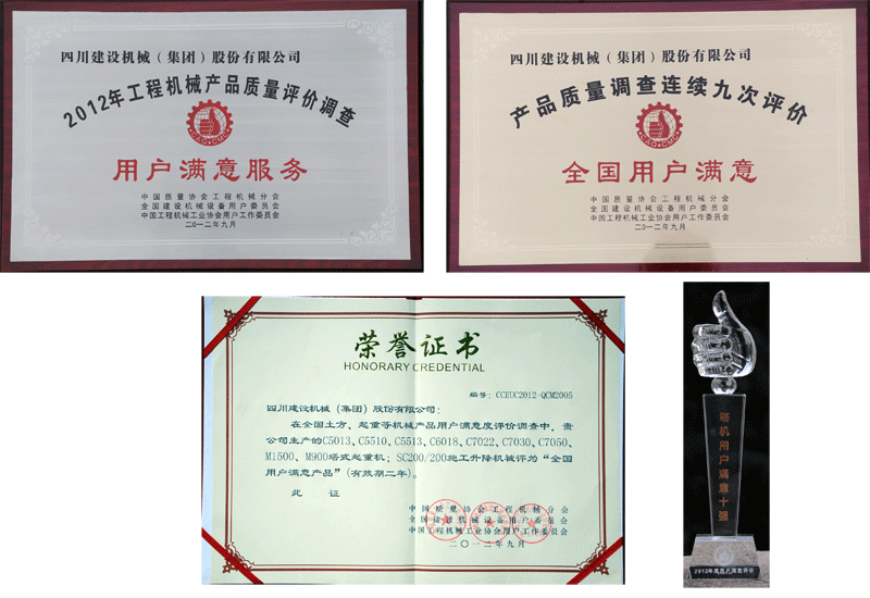 會議上,侯寶佳秘書長公布了用戶滿意產(chǎn)品、滿意服務(wù)企業(yè)及塔機用戶滿意十強等評選名單,對到會的企業(yè)代表及個人進行了現(xiàn)場表彰,并對連續(xù)三次以上獲得用戶滿意產(chǎn)品稱號的企業(yè)進行表彰。四川建設(shè)機械(集團)股份有限公司在2012年工程機械產(chǎn)品質(zhì)量評價調(diào)查中獲得“用戶滿意服務(wù)”,迄今為止已經(jīng)是(集團)公司產(chǎn)品“質(zhì)量調(diào)查連續(xù)九次評價全國用戶滿意”。公司生產(chǎn)的C5013、C5510、C5513、C6018、C7022、C7030、C7050、M900、M1500塔式起重機以及SC200/200施工升降機被評為“全國用戶滿意產(chǎn)品”。同時,協(xié)會在用戶滿意產(chǎn)品的基礎(chǔ)上評選出2012年塔式起重機行業(yè)“全國塔機用戶滿意十強”企業(yè),包括四川建設(shè)機械(集團)股份有限公司、撫順永茂建筑機械有限公司、中聯(lián)重科股份有限公司、廣西建工集團建筑機械制造有限責(zé)任公司、北京永茂建工機械制造有限公司、沈陽三洋建筑機械有限公司、浙江省建設(shè)機械集團有限公司、湖北江漢建筑工程機械有限公司、浙江虎霸建設(shè)機械有限公司、江蘇正興建設(shè)機械有限公司。