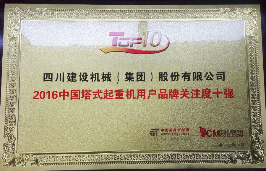 2017年1月3日,中國(guó)路面機(jī)械網(wǎng)和工程機(jī)械電商網(wǎng)在北京發(fā)布“2016中國(guó)塔式起重機(jī)用戶(hù)關(guān)注度排行榜”,四川建設(shè)機(jī)械(集團(tuán))股份有限公司進(jìn)入“2016中國(guó)塔式起重機(jī)用戶(hù)品牌關(guān)注度排行榜”前十強(qiáng),排名第二位。
